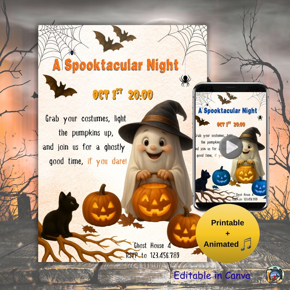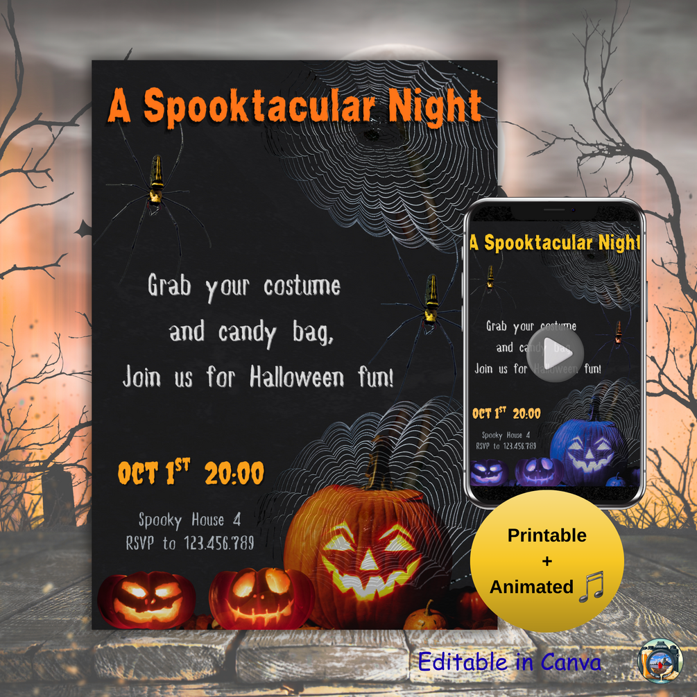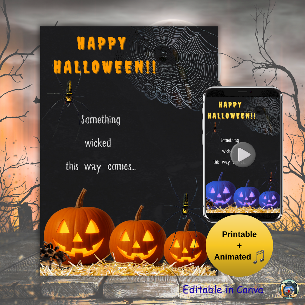 Editable Halloween Card Template | Printable & Animated Greeting Wishes, Invite | Spooky Pumpkin Canva Design