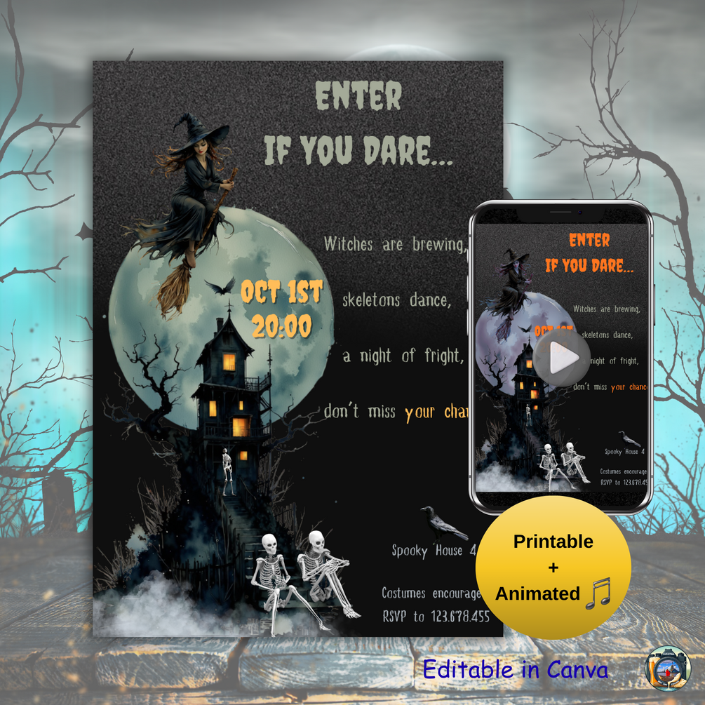 Halloween Party Invitation Template | Spooky Witch Skeleton Haunted House | Editable Printable Digital Animated Invite