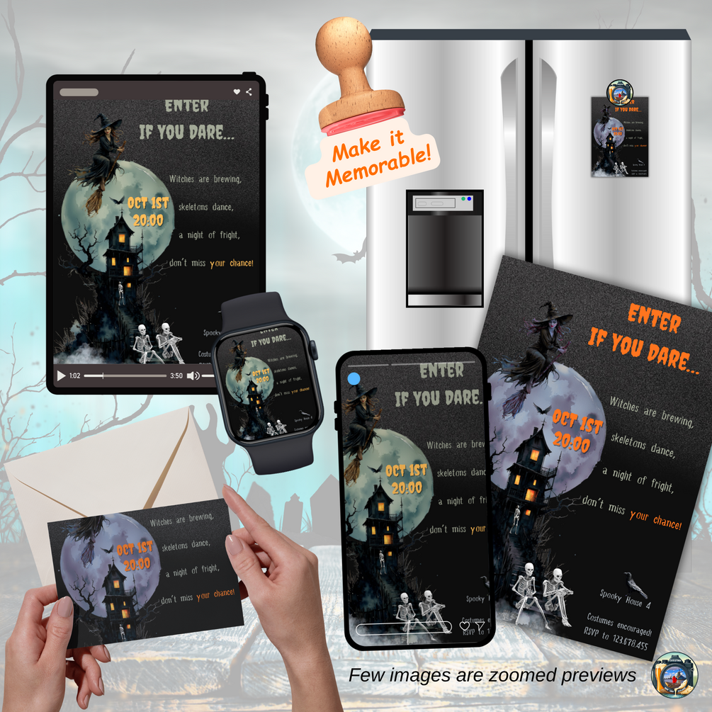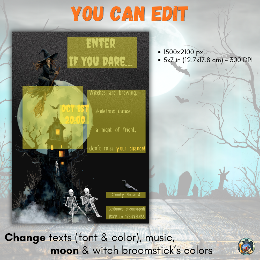 Spooky Halloween party invitation! Featuring witches, skeletons, and a haunted house under the full moon. Perfect for parties, instant download, editable, and printable.