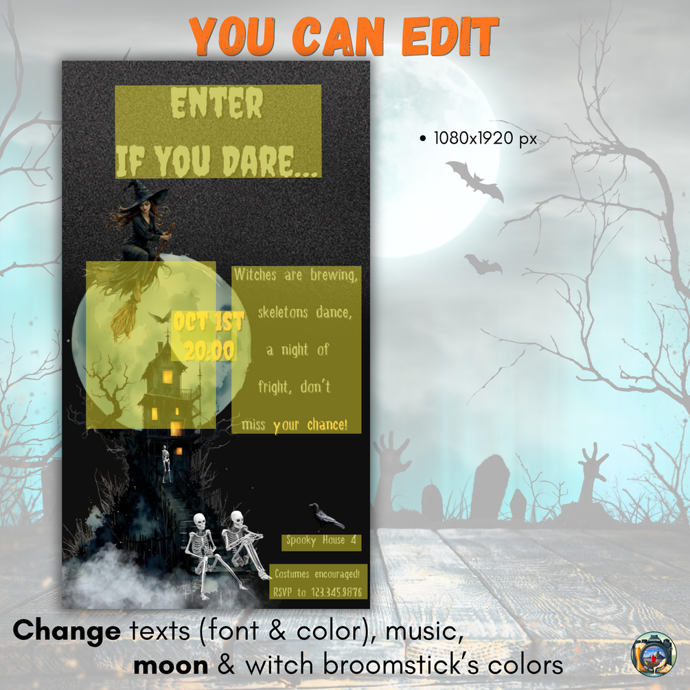 Spooky animated Halloween invitation with witch, skeletons, and haunted house. Digital-only, perfect for sending online. Editable and instant download.