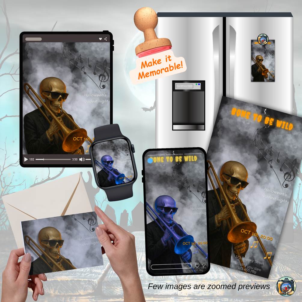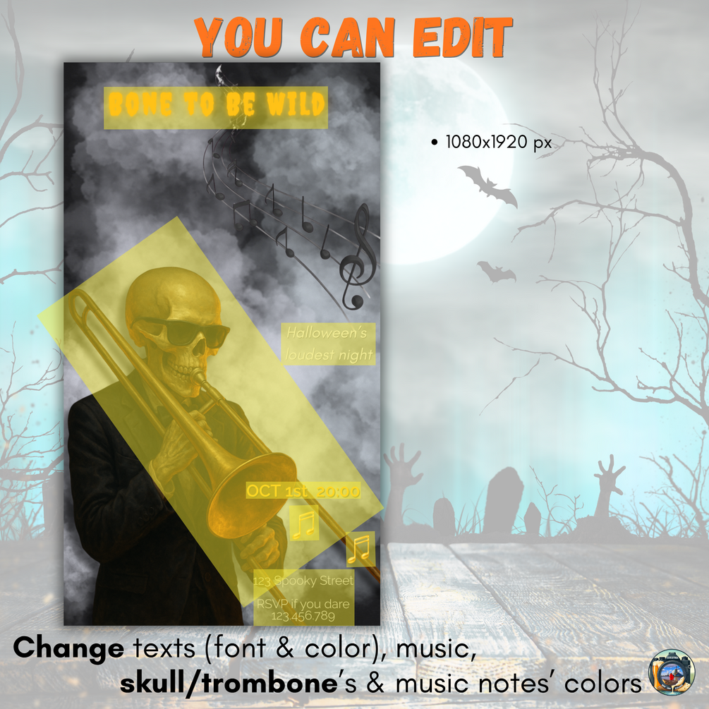 Halloween Invitation Template | Bone to Be Wild | Editable Canva Animated | Skeleton Trombone | Digital Invite